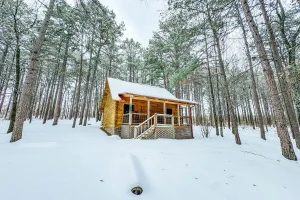 The Ozark Log Cabin boasts 1092 square feet, with covered front and back porches. Satellite TV’s. Two person whirlpool tub, walk in shower, full kitchen with dishwasher. King bed in master bedroom. Upper loft complete with queen bed, large sitting area. Outdoor Hot Tub on private covered porch, hammock, picnic table, fire pit, charcoal grill. Front porch swing.